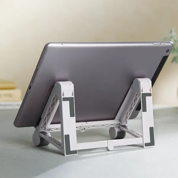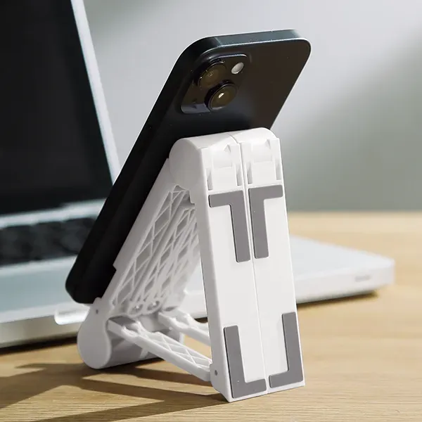 折り畳み可能なポータブルマルチモバイルスタンド。 折り畳み方を変えることでタブレットやスマートフォン、PCまでおけるスタンドに早変わり。 折り畳みができるので、大口のお申し込みでもかさばりません。